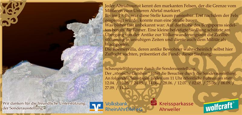Ich habe auch dieses Jahr für die Römervilla in Ahrweiler einen Flyer für die diesjährige Sonderaustellung erstellt. "Die Bunte Kuh" eine spätantike Höhensiedlung. Jeder Ahrtaltourist kennt den markanten Felsen, der die Grenze vom Mittleren zum Unteren Ahrtal makiert. Was bisher fast unbekannt war: Auf der Höhe des Bergsporns siedelten bereits die Römer. Eine kleine befestigte Siedlung schützte am Übergang von der Antike zur Völkerwanderungszeit die Zivilbevölkerung in unruhigen Zeiten und diente auch dem Militär als Wachposten.